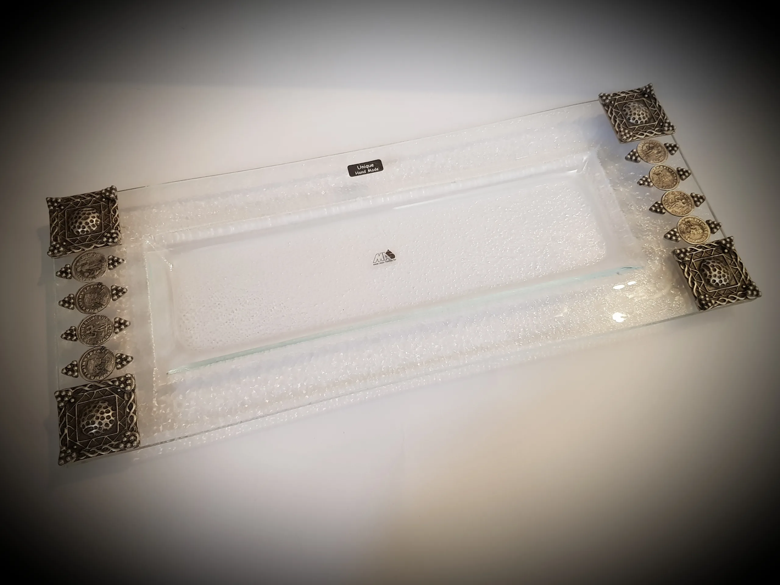 OPIS: Nakit i stakleni predmeti imaju interpolirane kopije originalnog rimskog novca kovanog u antičkoj Sisciji. Siscia je latinski naziv Siska u Rimskom Carstvu od 1. do 5. st., kada je ovaj grad bio i središte provincije Panonija Savije. Ovdje se od vladavine cara Galijana u drugoj polovici 3. st. do kraja 4. st. kovao zlatni, srebrni i brončani rimski novac s oznakama SIS ili SISC na poleđini svake kovanice ispod likova koji su vezani uz bitne događaje ili rimsku mitologiju, dok je na prednjici lik cara, s njegovim imenom i titulama.